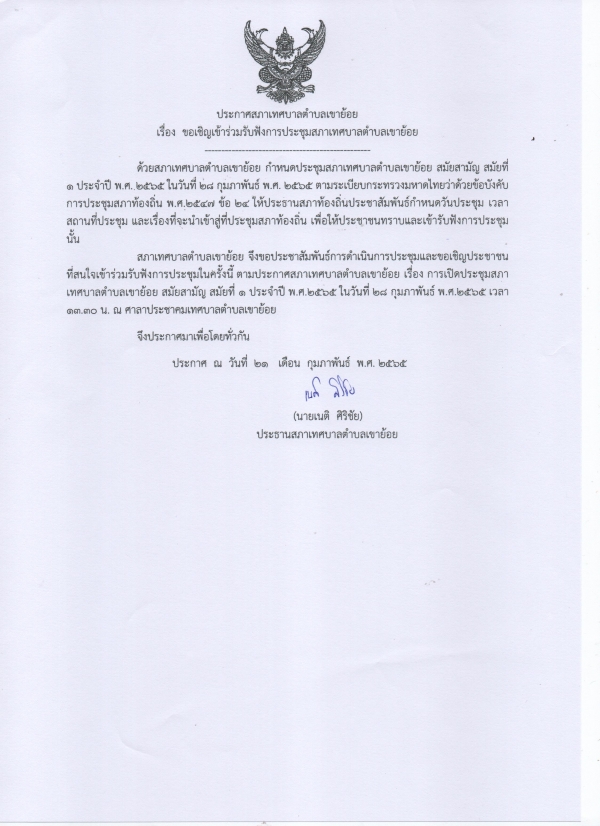 ขอเชิญเข้าร่วมรับฟังการประชุมสภาเทศบาลตำบลเขาย้อย สมัยสามัญ สมัยที่ 1/2565