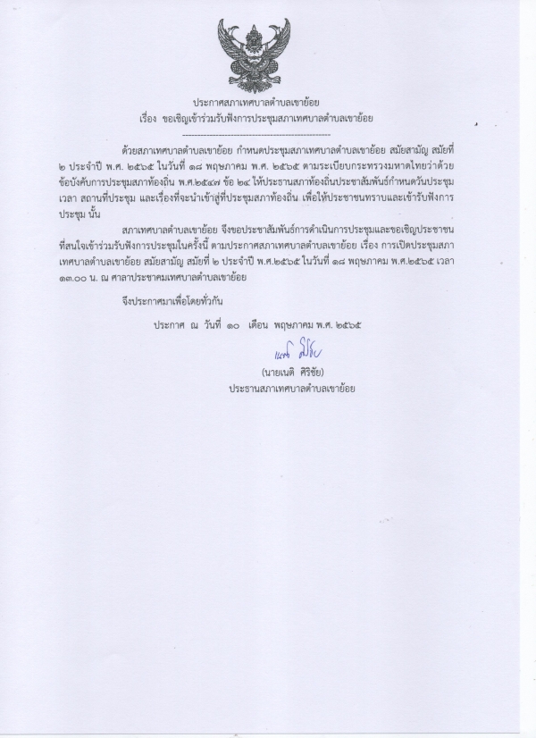 ขอเชิญเข้าร่วมรับฟังการประชุมสภาเทศบาลตำบลเขาย้อย สมัยสามัญ สมัยที่ 2/2565