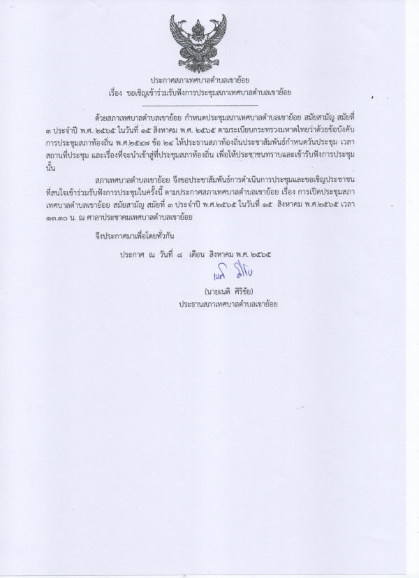 ขอเชิญเข้าร่วมรับฟังการประชุมสภาเทศบาลตำบลเขาย้อย สมัยสามัญ สมัยที่ 3/2565