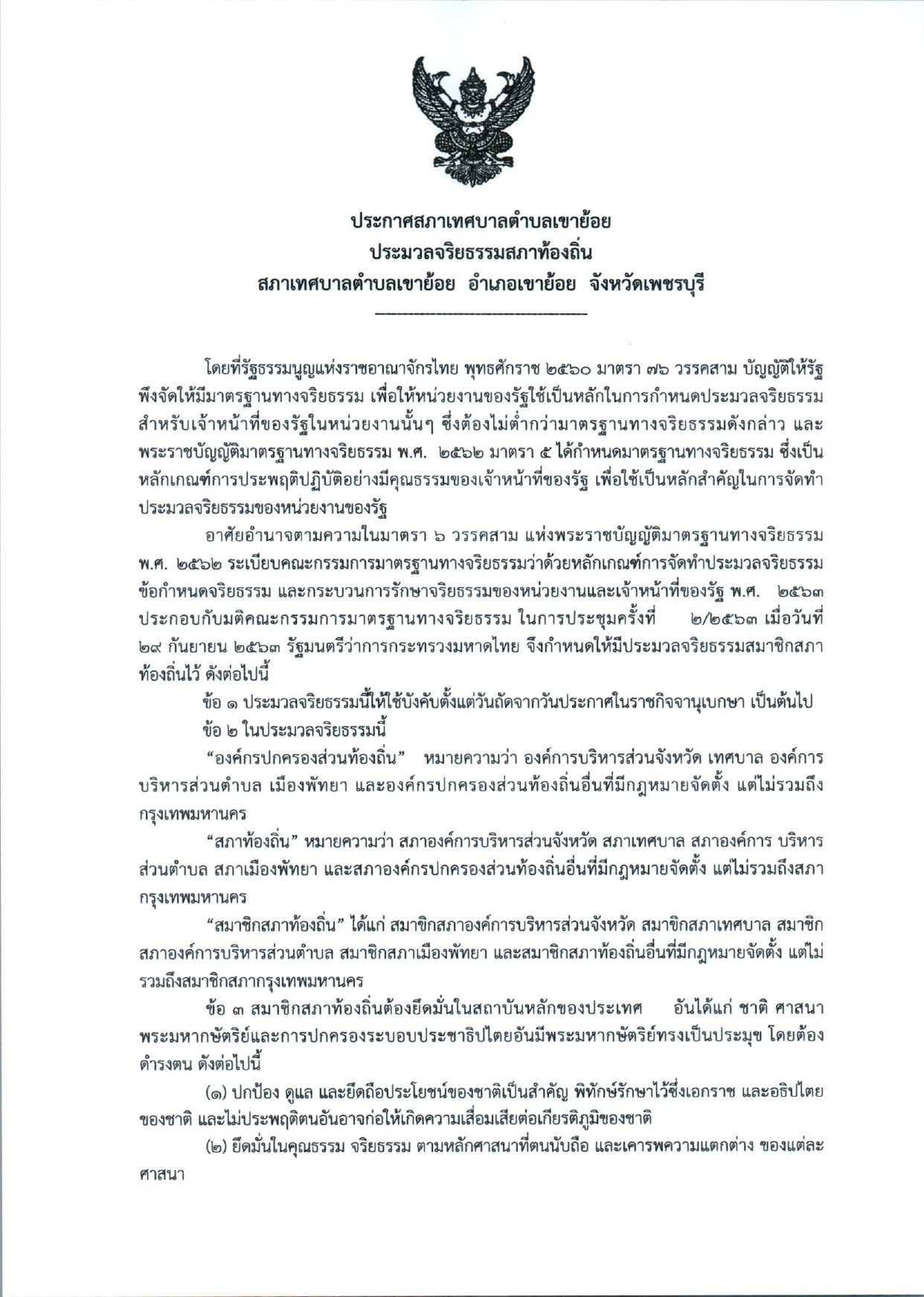 ประมวลจริยธรรมสภาท้องถิ่น สภาเทศบาลตำบลเขาย้อย อำเภอเขาย้อย จังหวัดเพชรบุรี