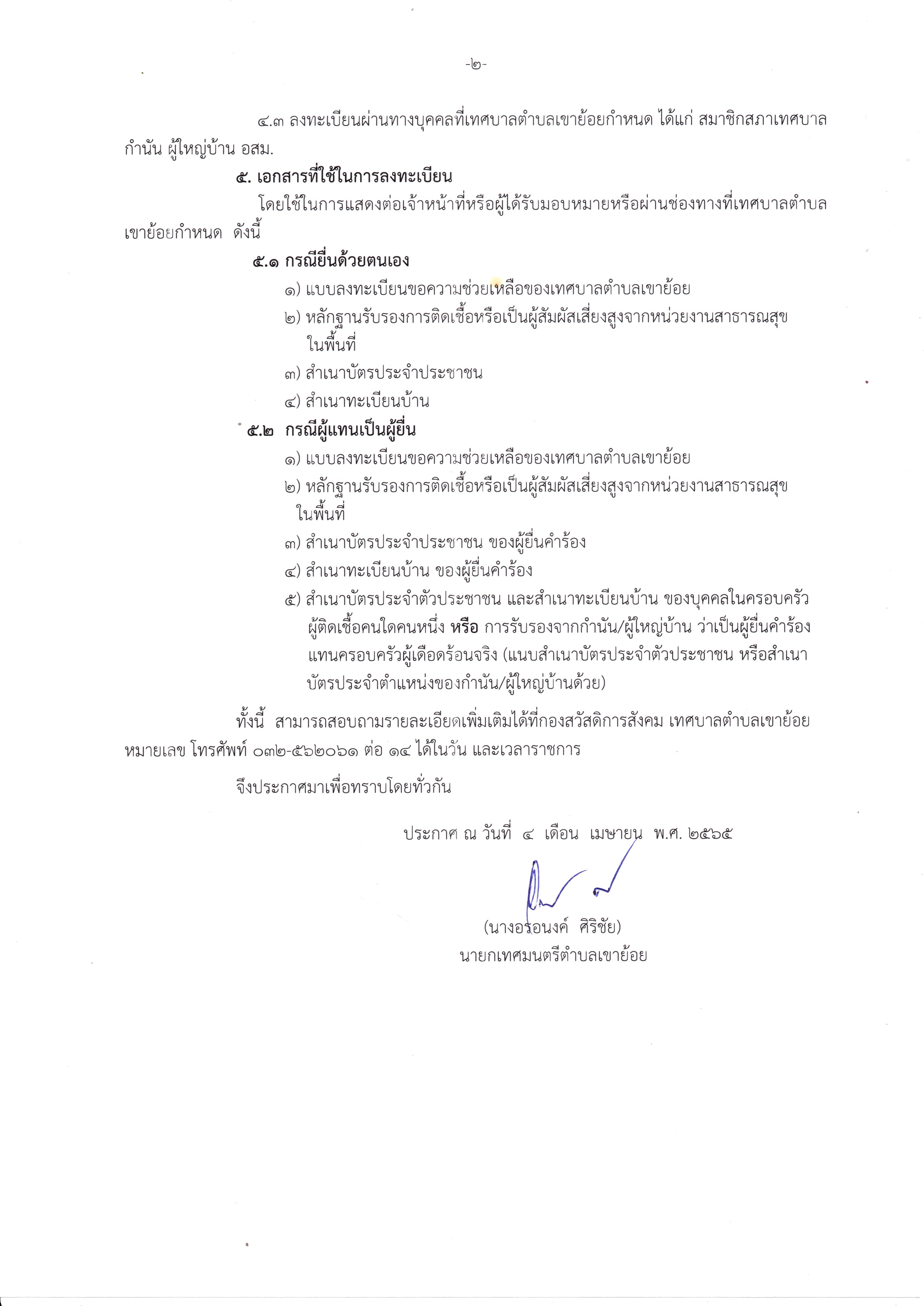 ประกาศเทศบาลตำบลเขาย้อย เรื่อง การลงทะเบียนขอความช่วยเหลือ กรณีได้รับความเดือดร้อนจากสถานการณ์การแพร่ระบาดของโรคติดเชื้อไรัสโคโรนา 2019 (โควิด-19)