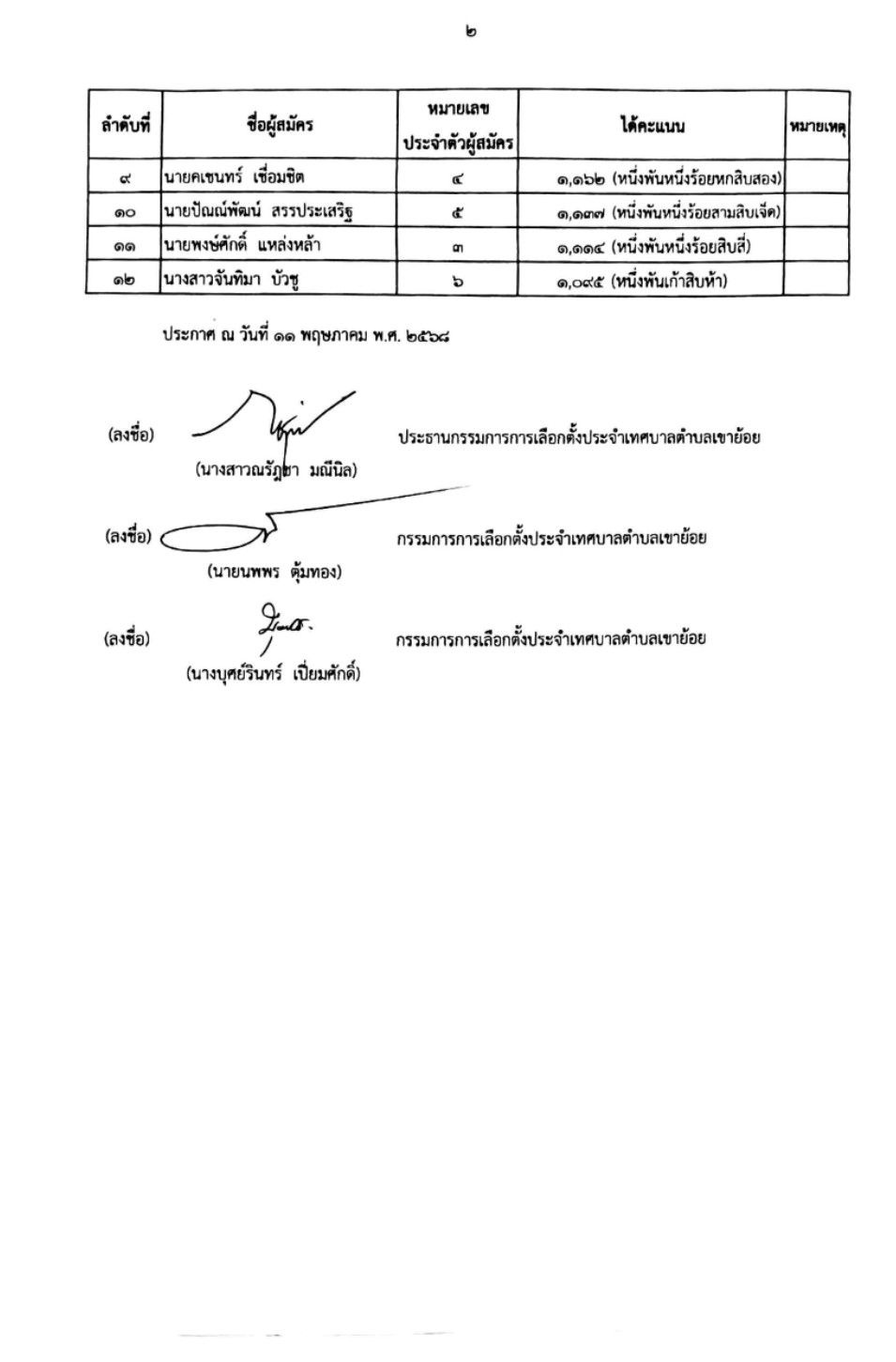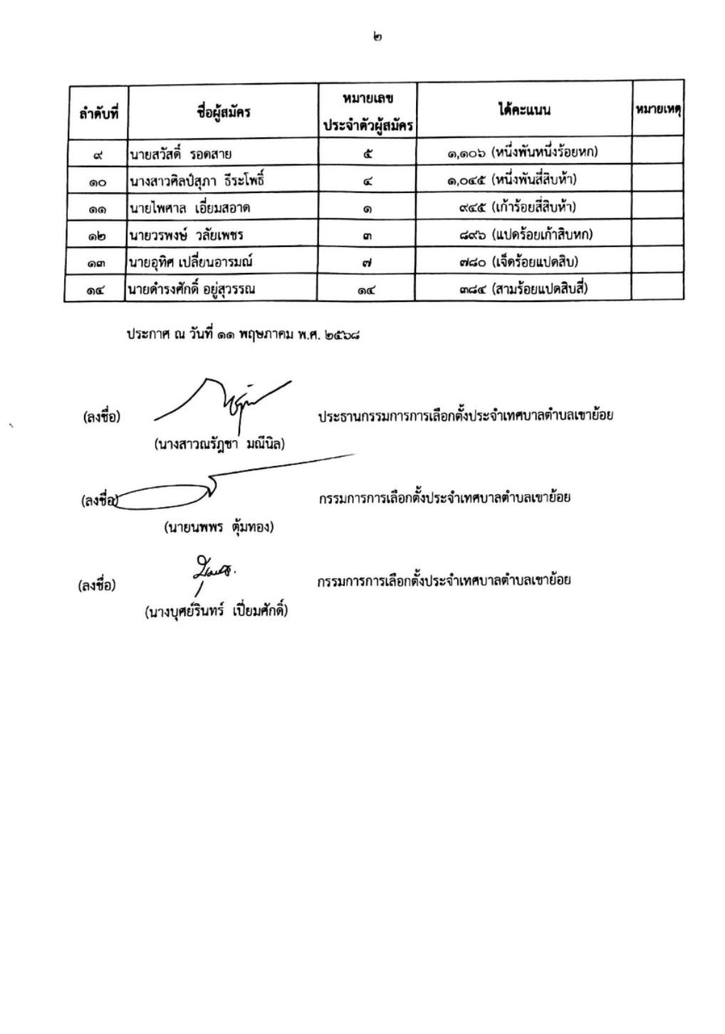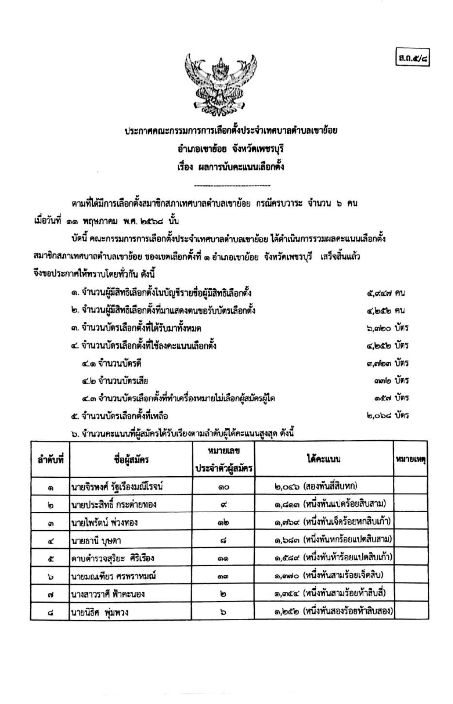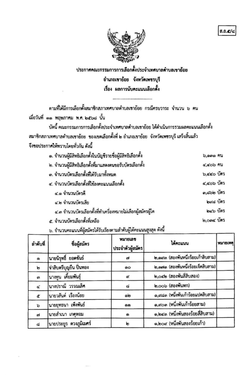 ประกาศคณะกรรมการการเลือกตั้งประจำเทศบาลตำบลเขาย้อย อำเภอเขาย้อย จังหวัดเพชรบุรี เรื่อง ผลการนับคะแนนเลือกตั้ง
