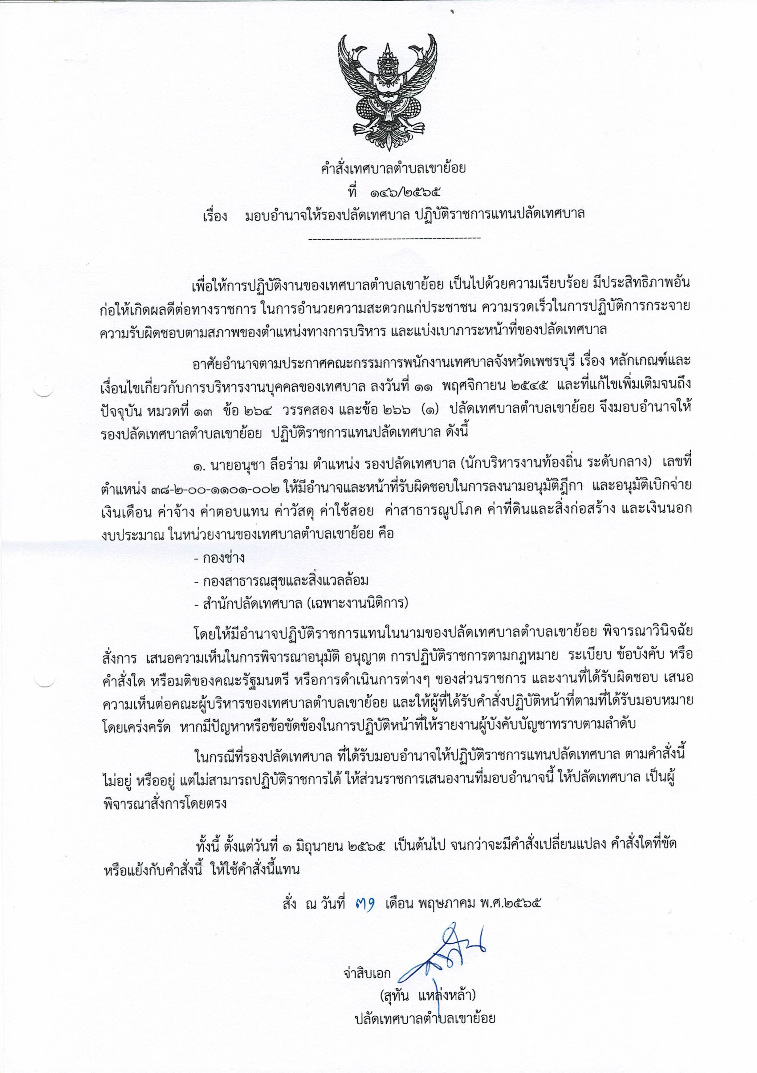 การกำหนดหน้าที่ความรับผิดชอบ การแบ่งงาน การบริหารงาน และการมอบหมายการปฏิบัติงาน ของพนักงานเทศบาล พนักงานครูเทศบาล ลูกจ้างประจำ และพนักงานจ้าง เทศบาลตำบลเขาย้อย