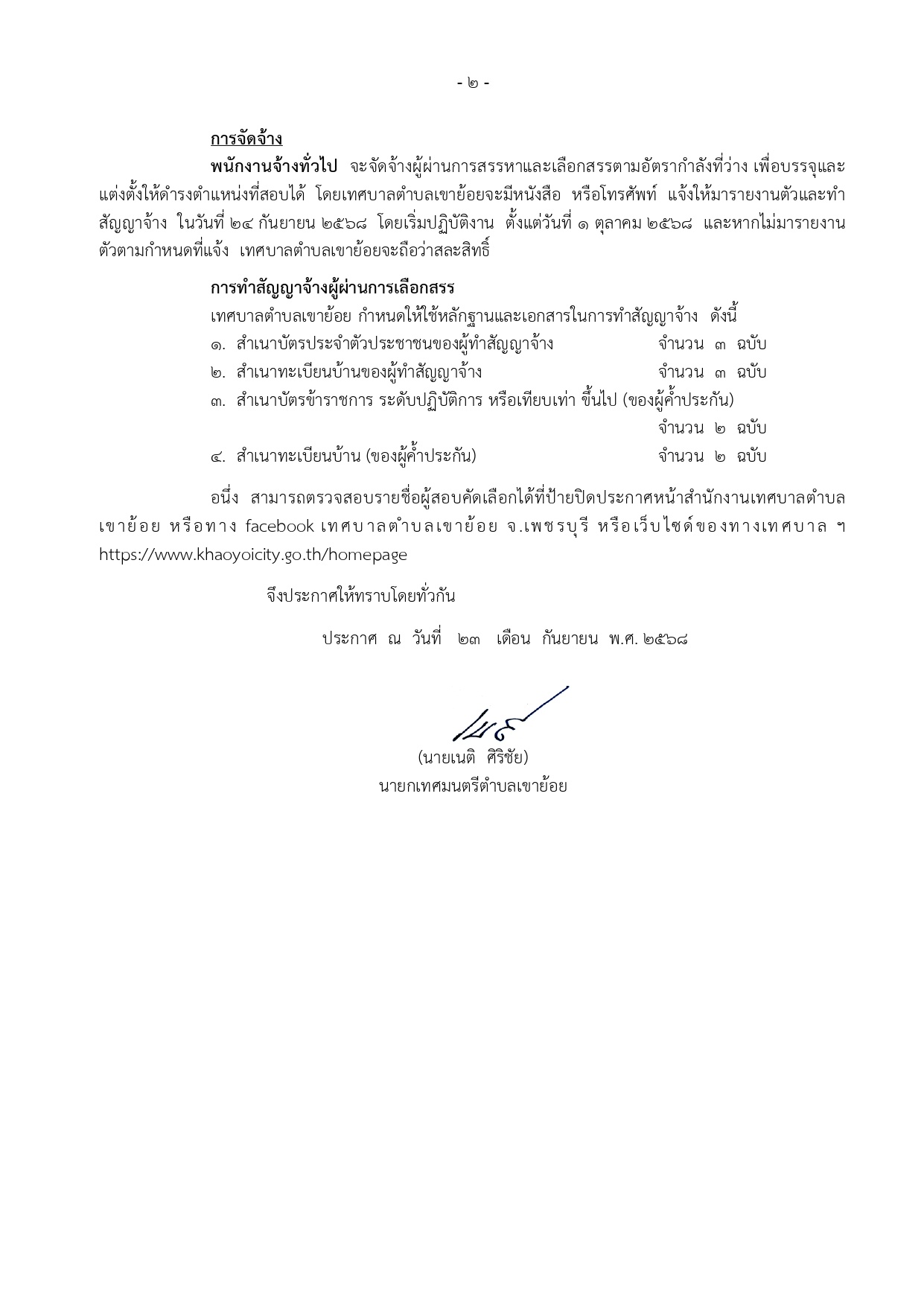 ประกาศผลสอบพนักงานจ้าง และขึ้นบัญชีรายชื่อผู้สอบคัดเลือกได้ เพื่อบรรจุแต่งตั้งเป็นพนักงานของเทศบาลตำบลเขาย้อย ประจำปีงบประมาณ 2568 ครั้งที่ 2