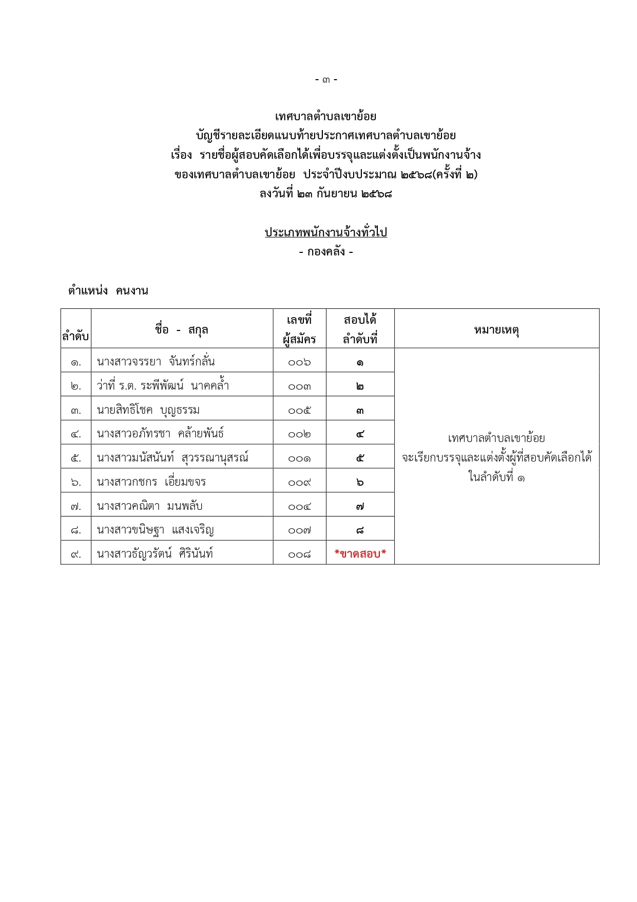 ประกาศผลสอบพนักงานจ้าง และขึ้นบัญชีรายชื่อผู้สอบคัดเลือกได้ เพื่อบรรจุแต่งตั้งเป็นพนักงานของเทศบาลตำบลเขาย้อย