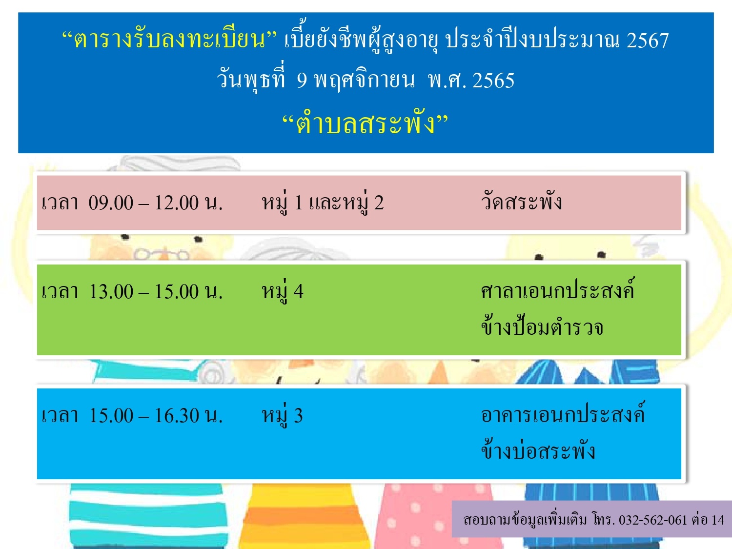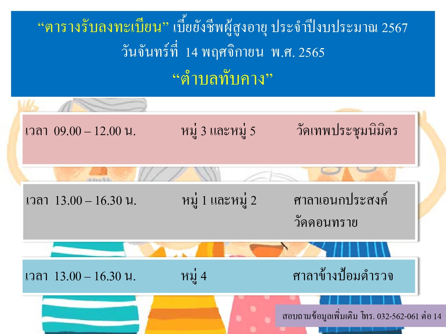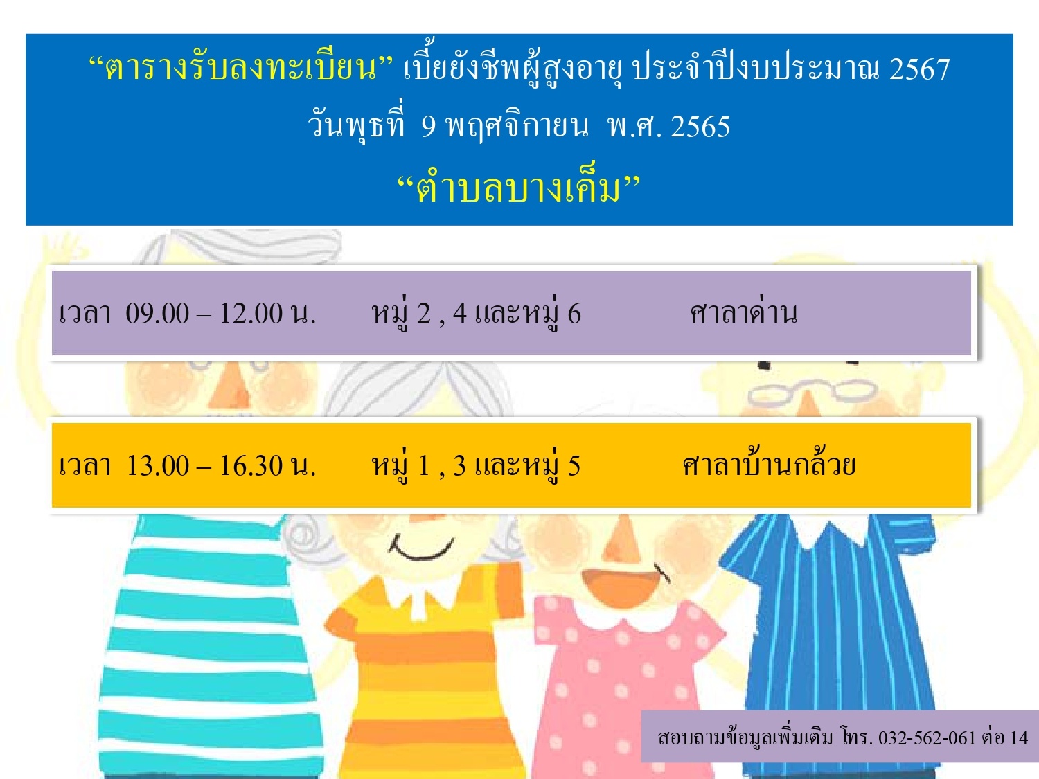 ประชาสัมพันธ์ถึงพี่ ๆ ที่จะมีอายุครบ 60 ปีบริบูรณ์ในปีงบประมาณ 2567 โดยเกิดก่อน 2 กันยายน 2506 - 1 กันยายน 2507 ขอความร่วมมือให้มาลงทะเบียนเพื่อรับเบี้ยยังชีพภายในเดือนพฤศจิกายนนี้ เพื่อเทศบาลฯ จะได้ดำเนินการขอรับการสนับสนุนด้านงบประมาณจากหน่วยงานด้านงบประมาณต่อไปค่ะ