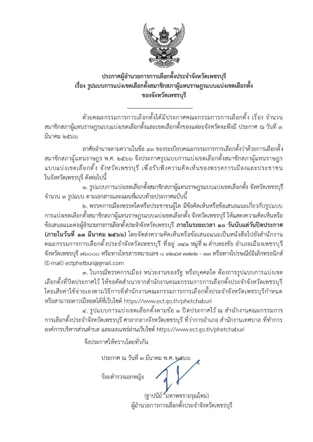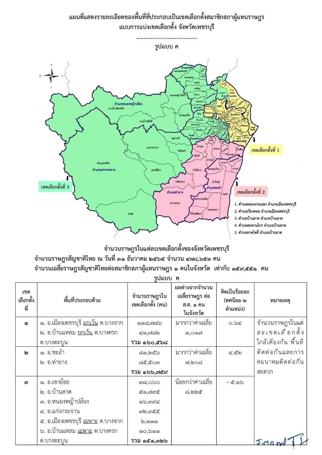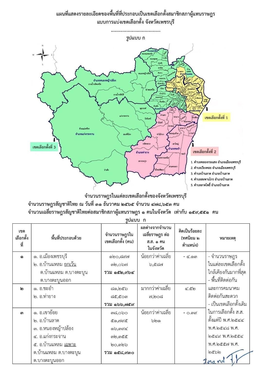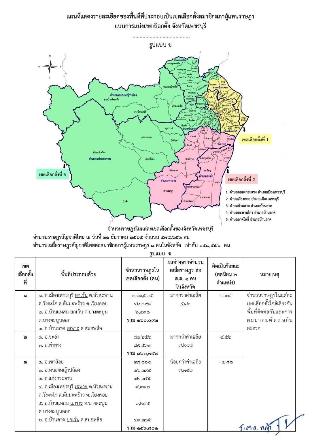 ประกาศรูปแบบการแบ่งเขตเลือกตั้งสมาชิกสภาผู้แทนราษฎรแบบแบ่งเขตเลือกตั้ง จังหวัดเพชรบุรี