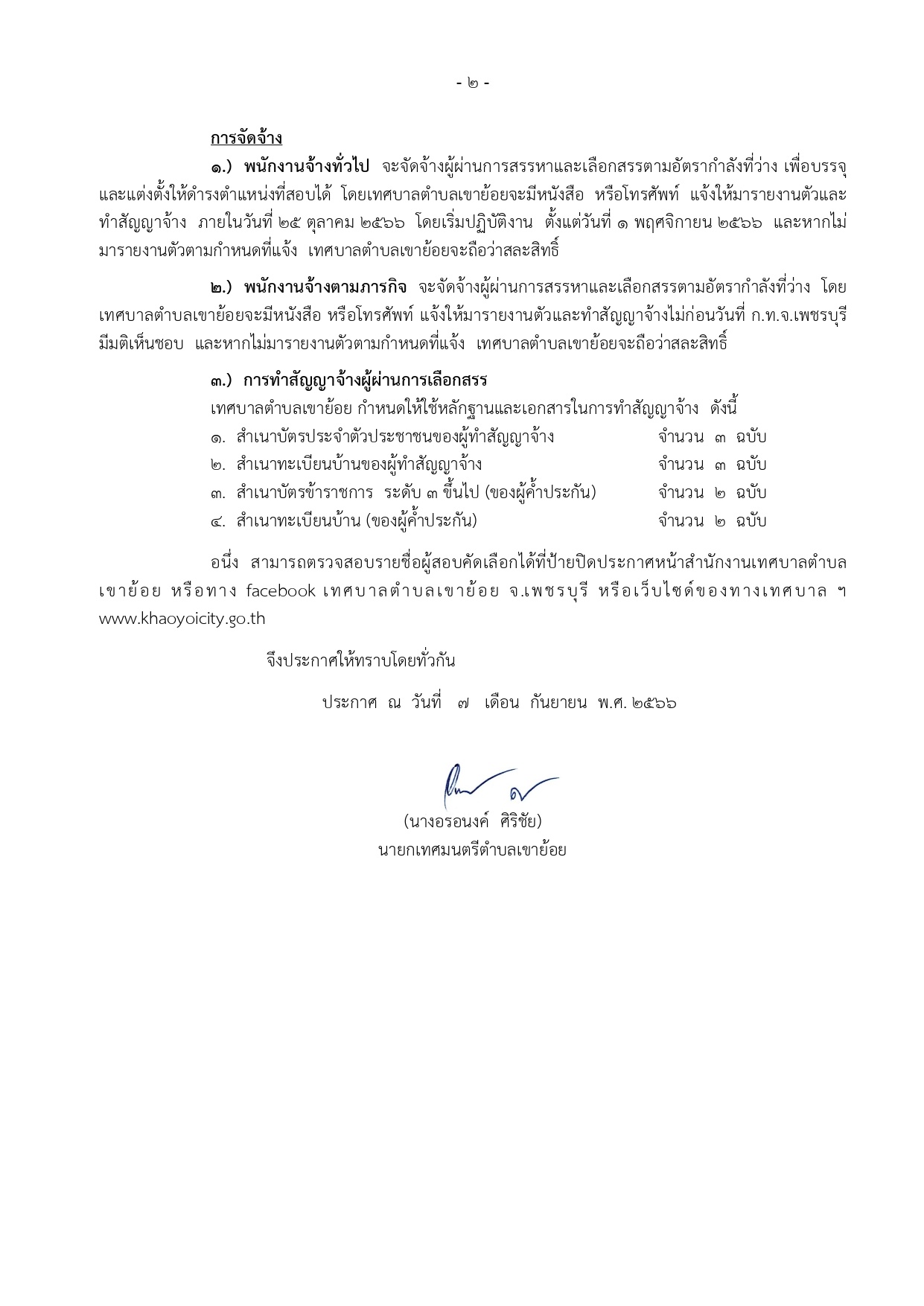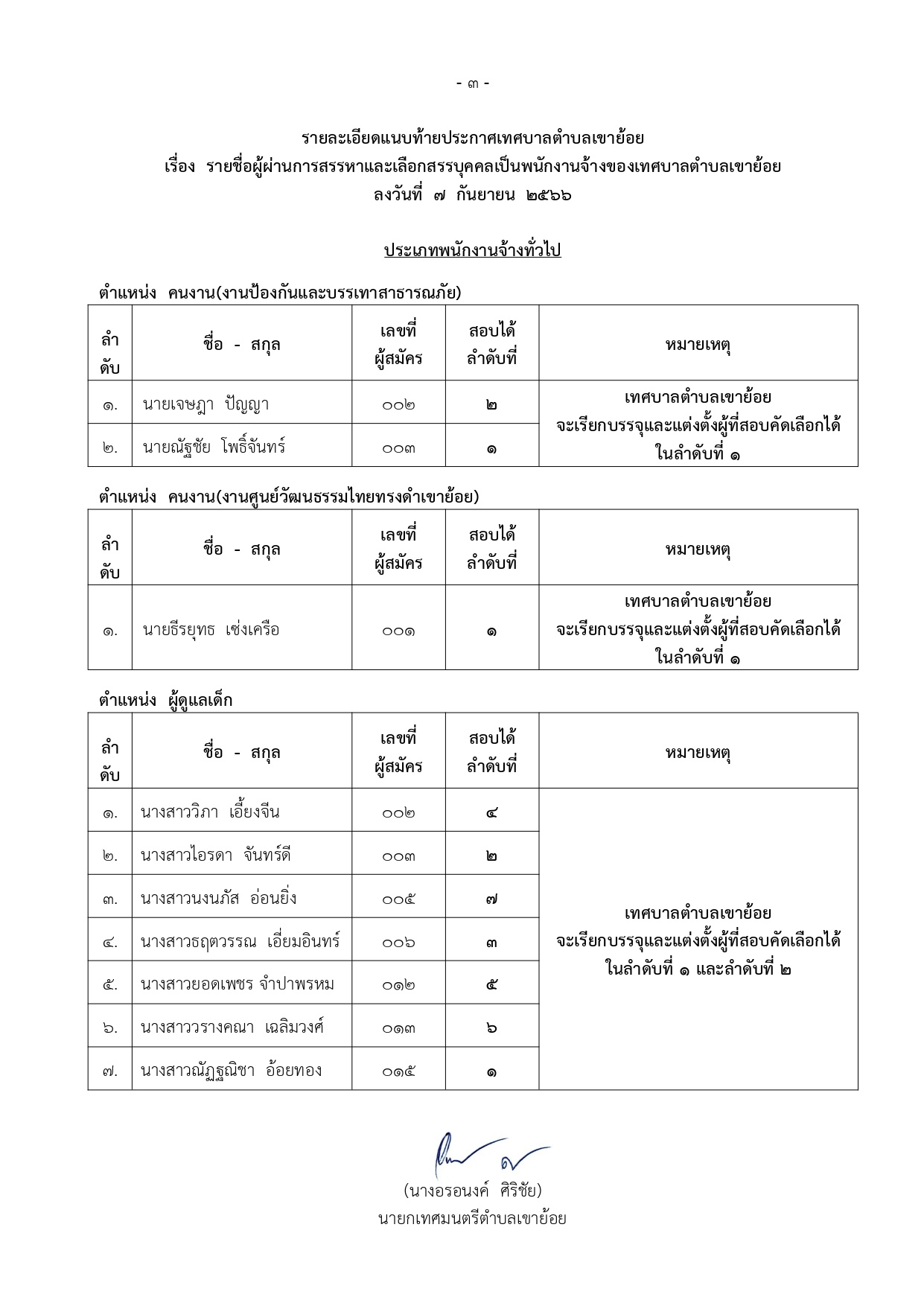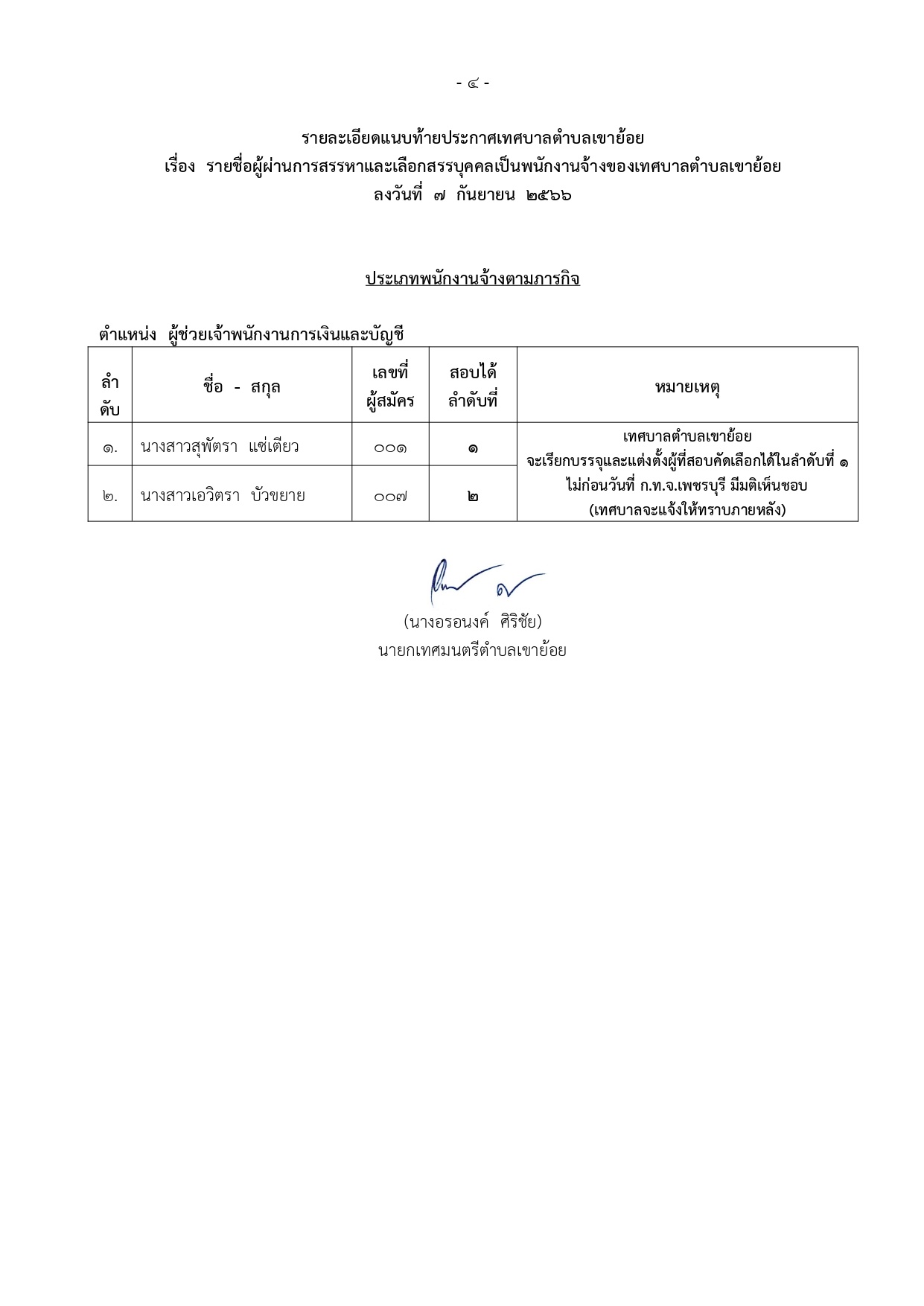 ประกาศเทศบาลตำบลเขาย้อย เรื่อง การประกาศผลสอบพนักงานจ้าง และขึ้นบัญชีรายชื่อผู้สอบคัดเลือกได้ เพื่อบรรจุและแต่งตั้งเป็นพนักงานจ้างของเทศบาลตำบลเขาย้อย ประจำปีงบประมาณ ๒๕๖๖ (ครั้งที่ ๒)
