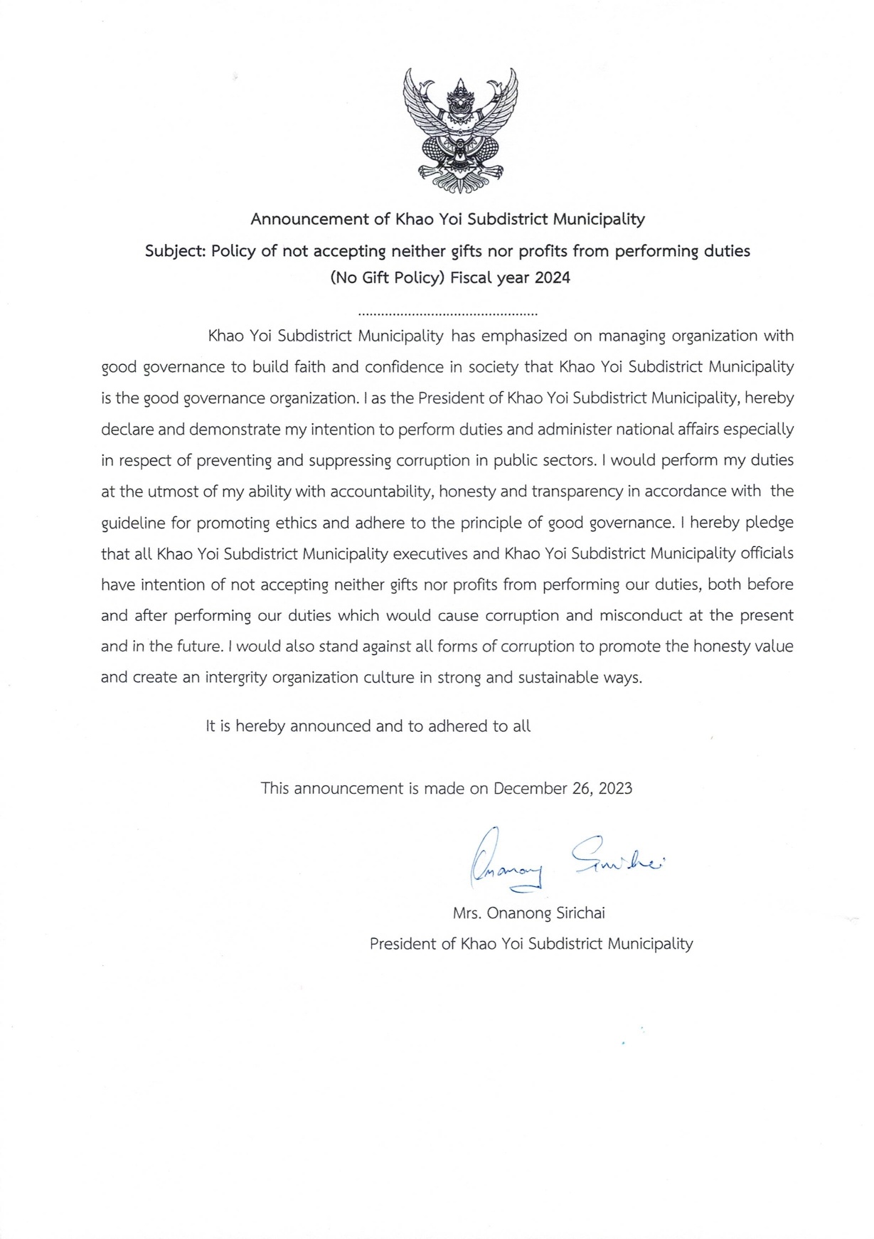 ประกาศเทศบาลตำบลเขาย้อย เรื่อง นโยบายการไม่รับของขวัญและของกำนัลทุกชนิดจากการปฏิบัติหน้าที่ (No Gift Policy) ของเทศบาลตำบลเขาย้อย ประจำปีงบประมาณ พ.ศ.2567