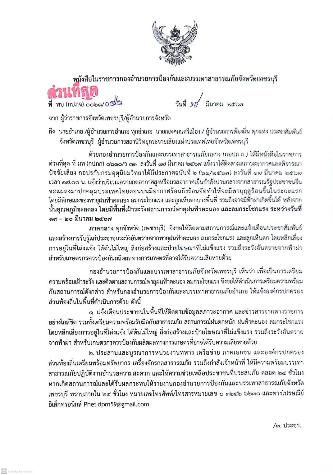 ประกาศด่วนจากกองอำนวยการป้องกันและบรรเทาสาธารณภัยจังหวัดเพชรบุรี