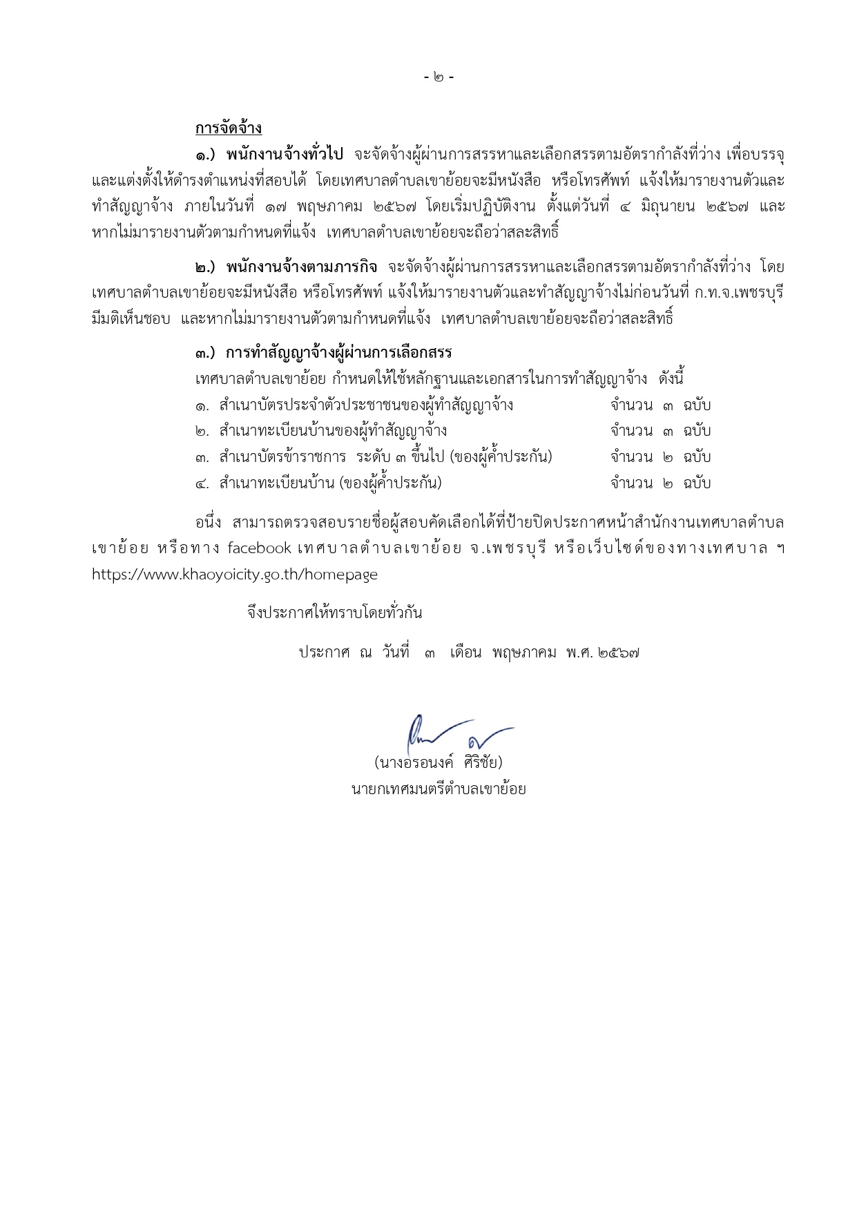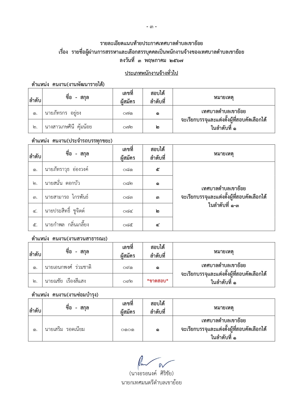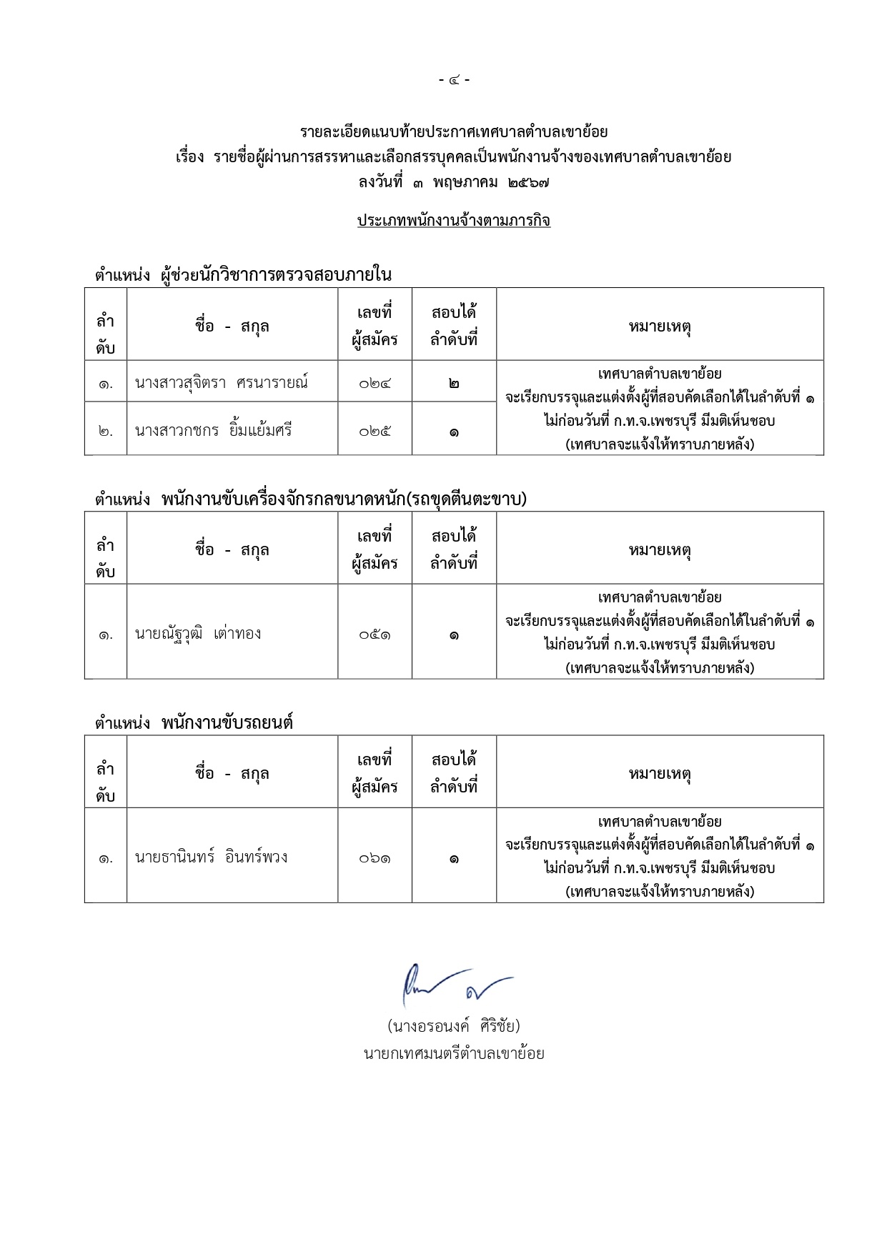 ประกาศเทศบาลตำบลเขาย้อย เรื่อง การประกาศผลสอบพนักงานจ้าง และขึ้นบัญชีรายชื่อผู้สอบคัดเลือกได้ เพื่อบรรจุและแต่งตั้งเป็นพนักงานจ้างของเทศบาลตำบลเขาย้อย ประจำปีงบประมาณ 2567
