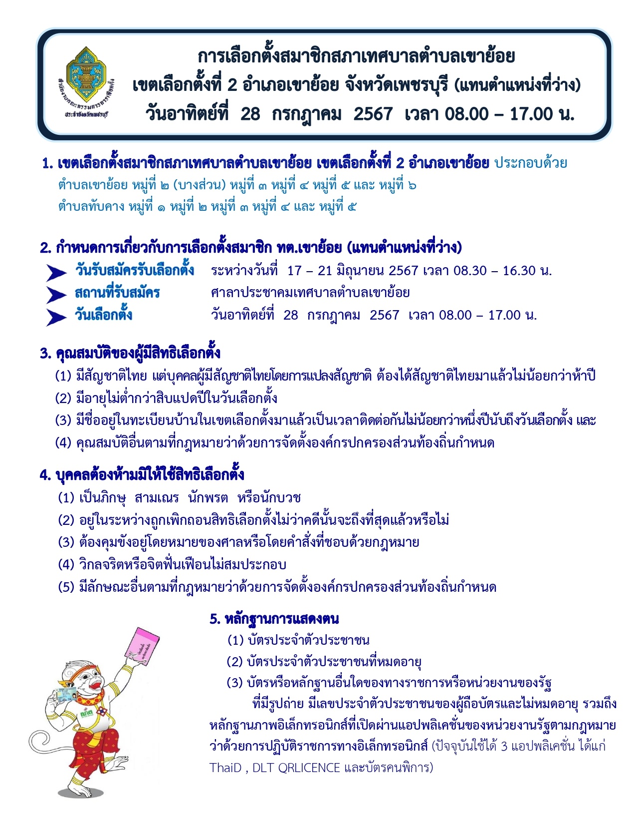 ข่าวประชาสัมพันธ์จากเทศบาลตำบลเขาย้อย เรื่อง ประชาสัมพันธ์การเลือกตั้งสมาชิกสภาเทศบาลตำบลเขาย้อย เขตเลือกตั้งที่ ๒ อำเภอเขาย้อย จังหวัดเพชรบุรี (แทนตำแหน่งที่ว่าง)
