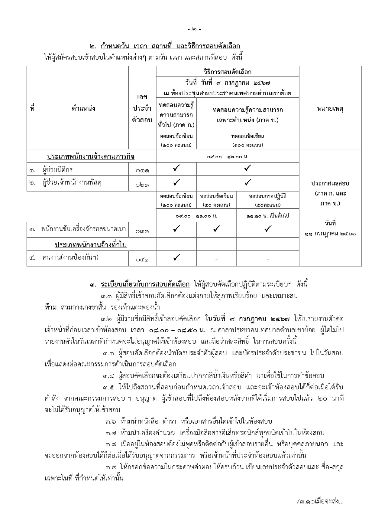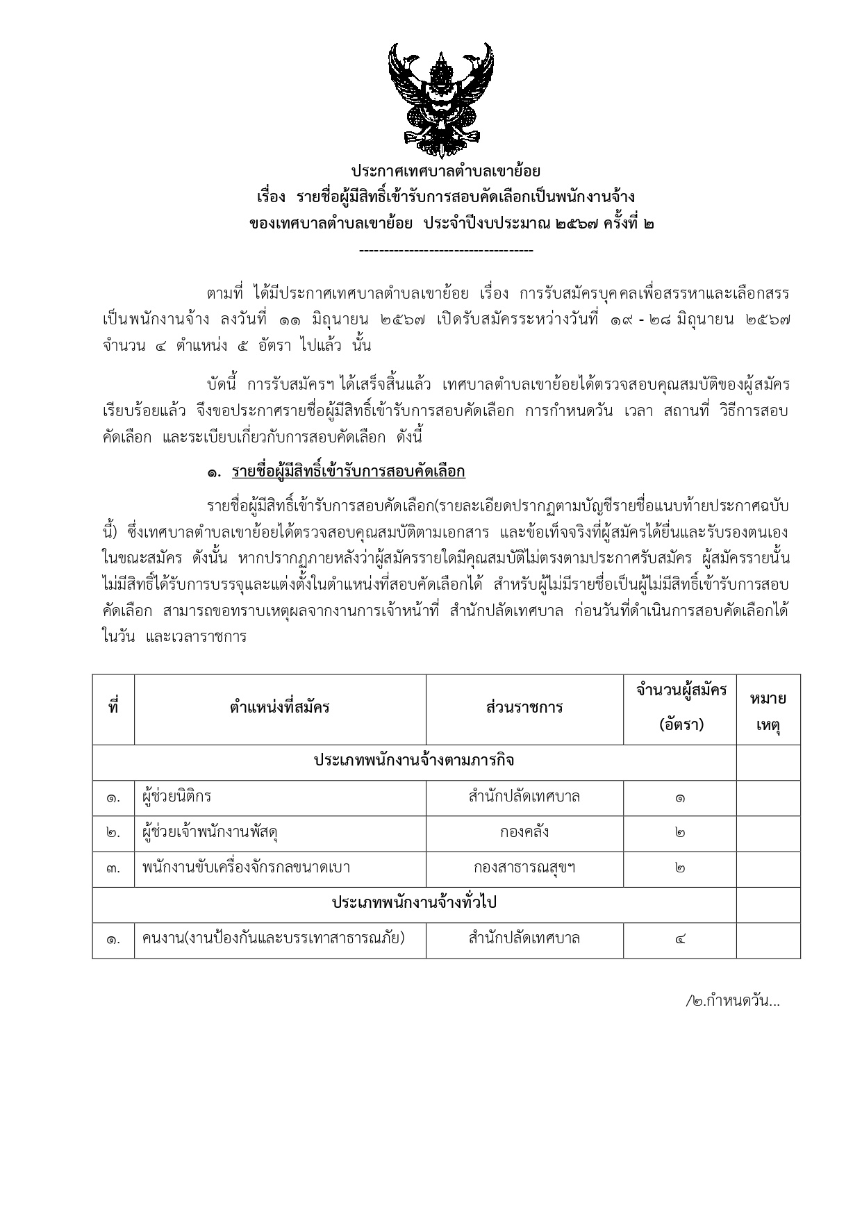 ประกาศเทศบาลตำบลเขาย้อยเรื่อง รายชื่อผู้มีสิทธิ์เข้ารับการสอบคัดเลือกเป็นพนักงานจ้างของเทศบาลตำบลเขาย้อย ประจำปีงบประมาณ 2567 ครั้งที่ 2