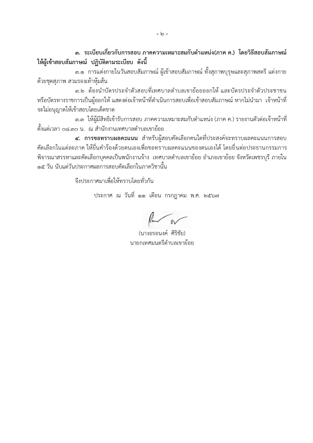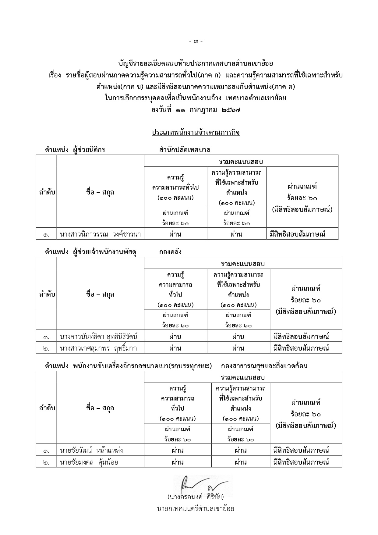 ประกาศเทศบาลตำบลเขาย้อย เรื่อง ประกาศรายชื่อผู้สอบผ่านภาคความรู้ความสามารถทั่วไป (ภาค ก.) และความรู้ความสามารถที่ใช้เฉพาะสำหรับตำแหน่ง (ภาค ข.) และมีสิทธิสอบภาคความเหมาะสมกับตำแหน่ง (ภาค ค.) ในการเลือกสรรบุคคลเพื่อเป็นพนักงานจ้างของเทศบาลตำบลเขาย้อย ประจำปีงบประมาณ 2567 ครั้งที่ 2