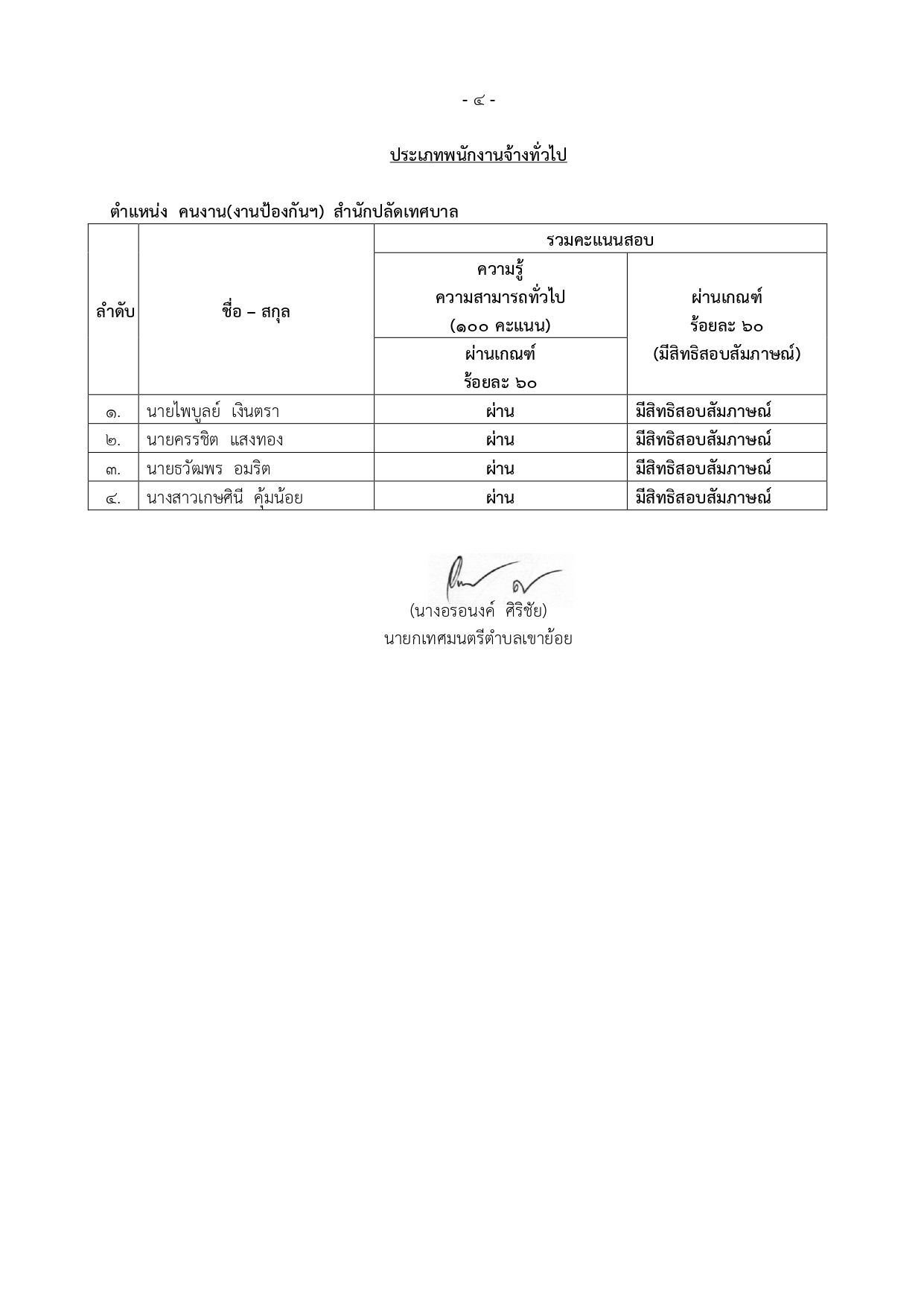 ประกาศเทศบาลตำบลเขาย้อย เรื่อง ประกาศรายชื่อผู้สอบผ่านภาคความรู้ความสามารถทั่วไป (ภาค ก.) และความรู้ความสามารถที่ใช้เฉพาะสำหรับตำแหน่ง (ภาค ข.) และมีสิทธิสอบภาคความเหมาะสมกับตำแหน่ง (ภาค ค.) ในการเลือกสรรบุคคลเพื่อเป็นพนักงานจ้างของเทศบาลตำบลเขาย้อย