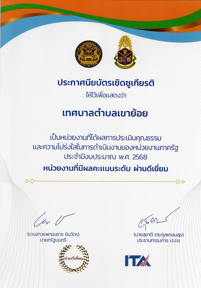 เทศบาลตำบลเขาย้อย ได้รับประกาศนียบัตรเชิดชูเกียรติ เป็นหน่วยงานที่ได้รับผลการประเมินคุณธรรมและความโปร่งใสในการดำเนินงานของหน่วยงานภาครัฐ ประจำปีงบประมาณ พ.ศ. 2568 ระดับผ่านดีเยี่ยม จากสำนักงาน ป.ป.ช.