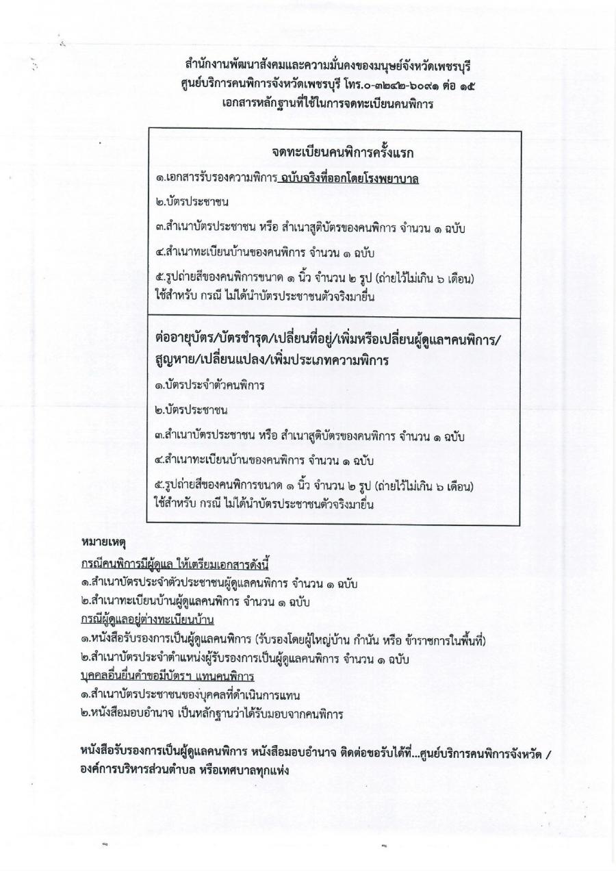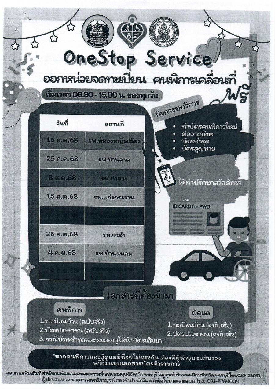 ข่าวประชาสัมพันธ์เทศบาลตำบลเขาย้อย สำนักงานพัฒนาสังคมและความมั่นคงของมนุษย์จังหวัดเพชรบุรี ขอประชาสัมพันธ์ การออกหน่วยจดทะเบียน คนพิการเคลื่อนที่ One Stop Service (OSS)