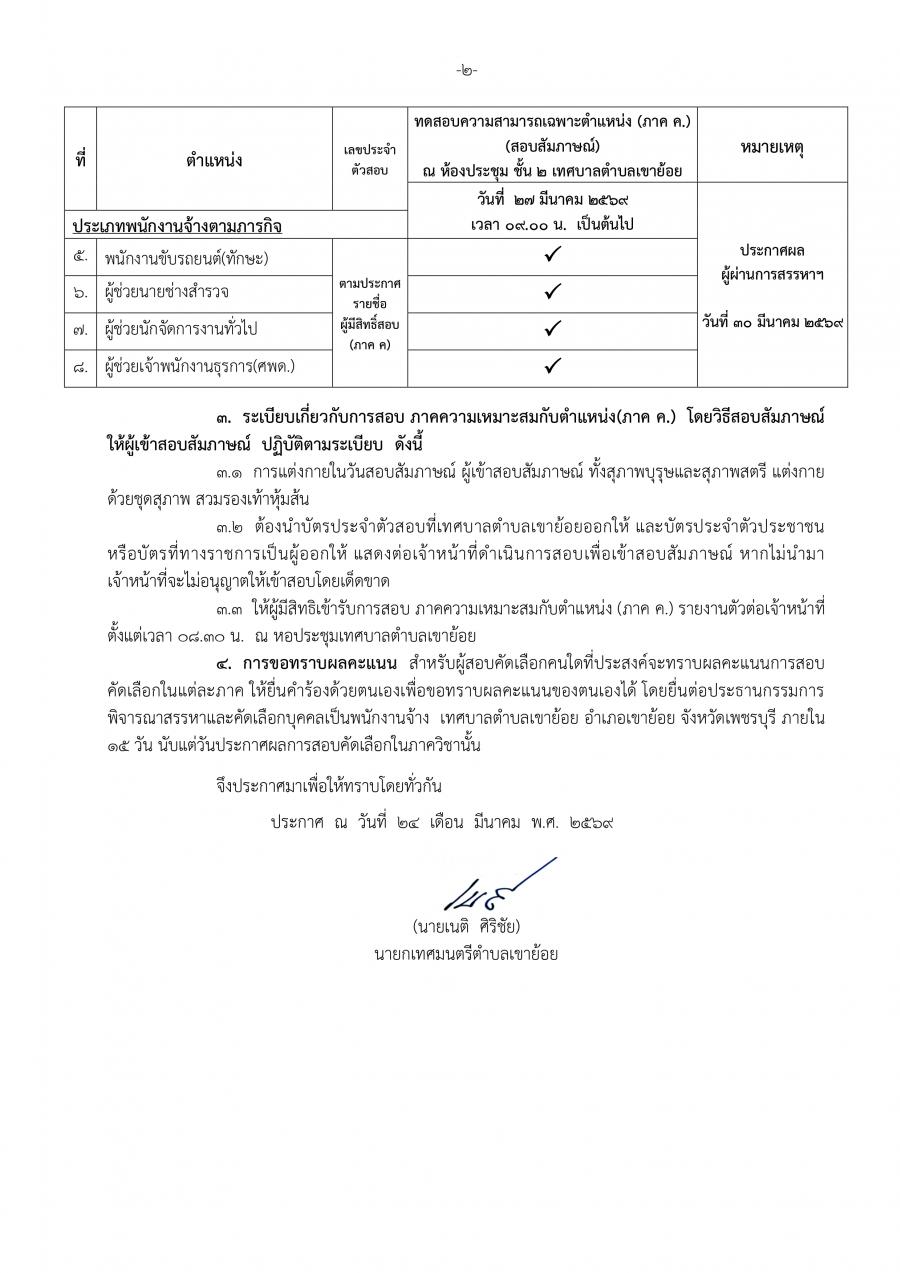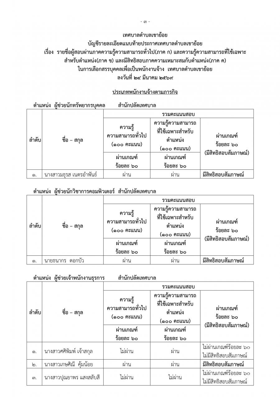 ประกาศเทศบาลตำบลเขาย้อย เรื่อง ประกาศรายชื่อผู้สอบผ่านภาคความรู้ความสามารถทั่วไป (ภาค ก.) และความรู้ความสามารถ ที่ใช้เฉพาะสำหรับตำแหน่ง(ภาค ข.) และมีสิทธิสอบภาคความเหมาะสมกับตำแหน่ง(ภาค ค.) ในการเลือกสรรบุคคลเพื่อเป็นพนักงานจ้างของเทศบาลตำบลเขาย้อย ประจำปีงบประมาณ 2569
