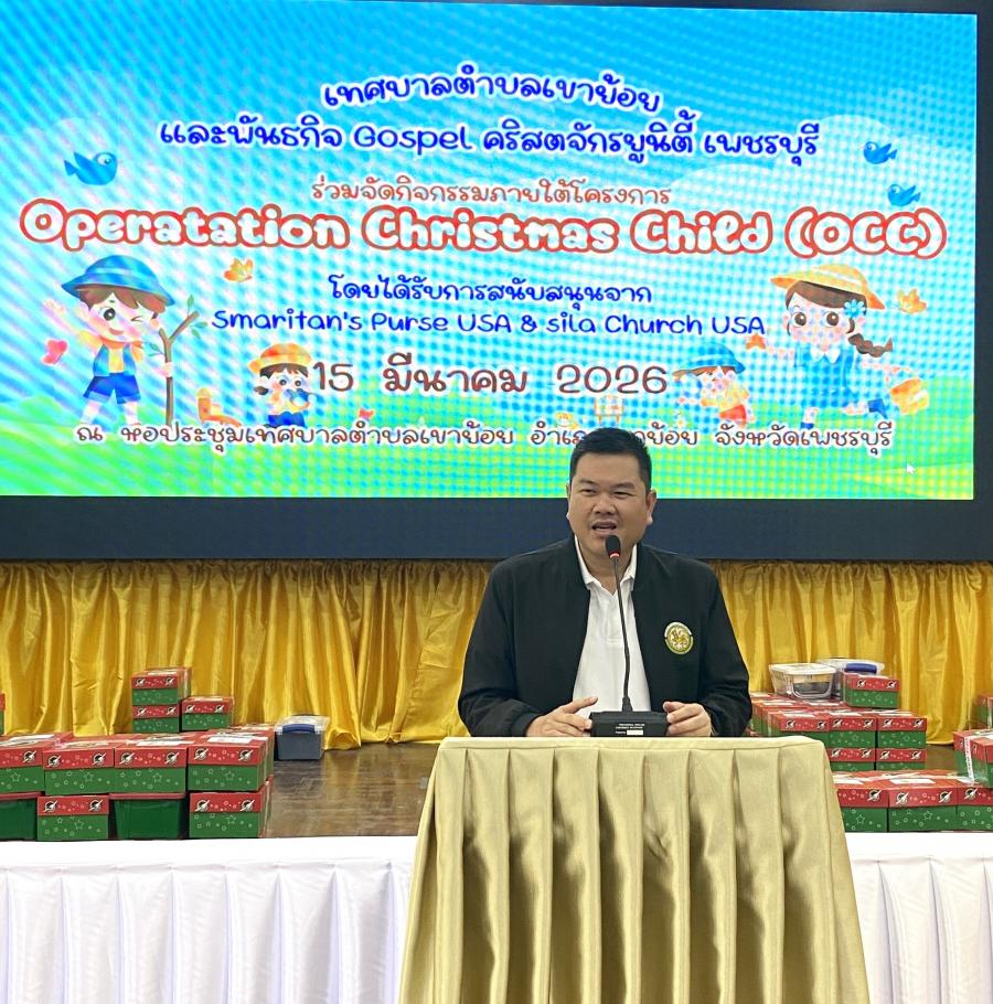 วันอาทิตย์ที่ 15 มีนาคม พ.ศ. 2569 เทศบาลตำบลเขาย้อย ร่วมกับคริสตจักรยูนิตี้ เพชรบุรี ร่วมจัดกิจกรรม Operatation Christmas Child โดยนายเนติ ศิริชัย นายกเทศมนตรีตำบลเขาย้อย เป็นประธานพิธีเปิดโครงการฯ พร้อมด้วยคณะผู้บริหาร ที่ปรึกษานายกเทศมนตรีฯ สมาชิกสภาเทศบาล คณะทำงานสนับสนุนการขับเคลื่อนยุทธศาสตร์ฯ มอบของขวัญให้กับเด็กอายุ 2 - 14 ปี ณ หอประชุมเทศบาลตำบลเขาย้อย