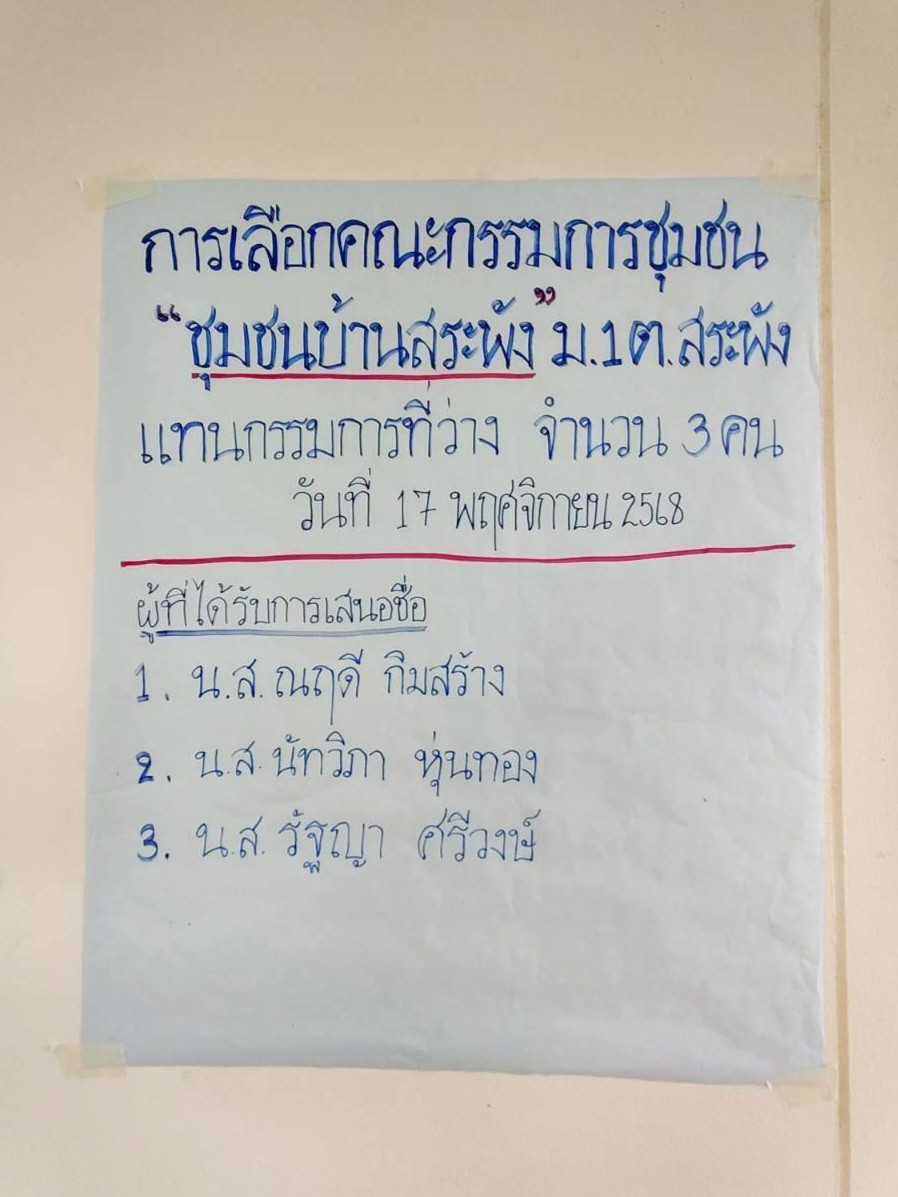 วันจันทร์ที่ 17 พฤศจิกายน 2568 เวลา 10:00 น. นางอรอนงค์ ศิริชัย ที่ปรึกษานายกเทศมนตรีตำบลเขาย้อย ประธานสภาเทศบาล รองประธานสภาเทศบาล สมาชิกสภาเทศบาล คณะทำงานสนับสนุนการขับเคลื่อนยุทธศาสตร์เทศบาลตำบลเขาย้อย และกองสวัสดิการสังคม เข้าร่วมกิจกรรมประชุมเลือกคณะกรรมการชุมชนบ้านสระพัง แทนกรรมการที่ว่าง จำนวน 3 คน พร้อมดำเนินการจัดประชุมเลือกตำแหน่งกรรมการเรียบร้อยแล้ว ณ ศาลาอ่านหนังสือประจำหมู่บ้าน หมู่ 1 ต.สระพัง โดยกองสวัสดิการสังคมจะดำเนินการจัดทำคำสั่งแต่งตั้งคณะกรรมการชุมชนบ้านสระพังตามระเบียบที่เกี่ยวข้องต่อไป
