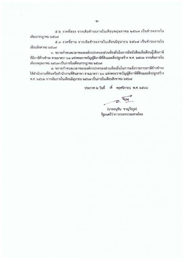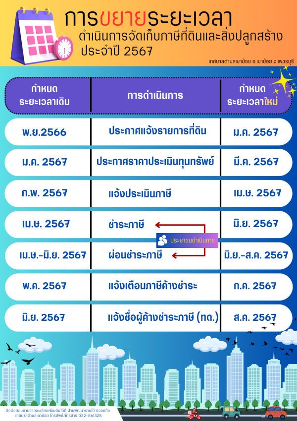 ประกาศเทศบาลตำบลเขาย้อย เรื่อง การขยายกำหนดเวลาดำเนินการตามพระราชบัญญัติภาษีที่ดินและสิ่งปลูกสร้าง พ.ศ.๒๕๖๒ ประจำปีงบประมาณ พ.ศ.๒๕๖๗