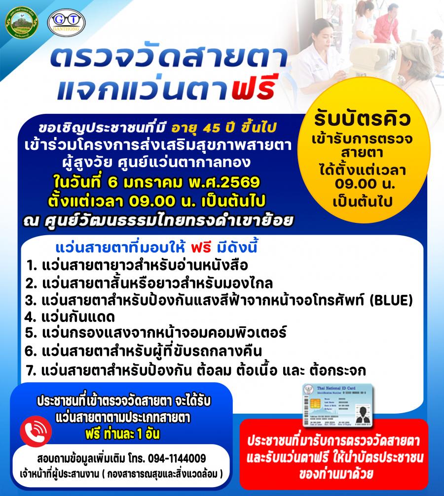 ขอเชิญประชาชนที่มี อายุ 45 ปี ขึ้นไป เข้าร่วมโครงการส่งเสริมสุขภาพสายตาผู้สูงวัย ศูนย์แว่นตากาลทอง ในวันที่ 6 มกราคม พ.ศ.2569 ตั้งแต่เวลา 09.00 น. เป็นต้นไป ณ ศูนย์วัฒนธรรมไทยทรงดำเขาย้อย
