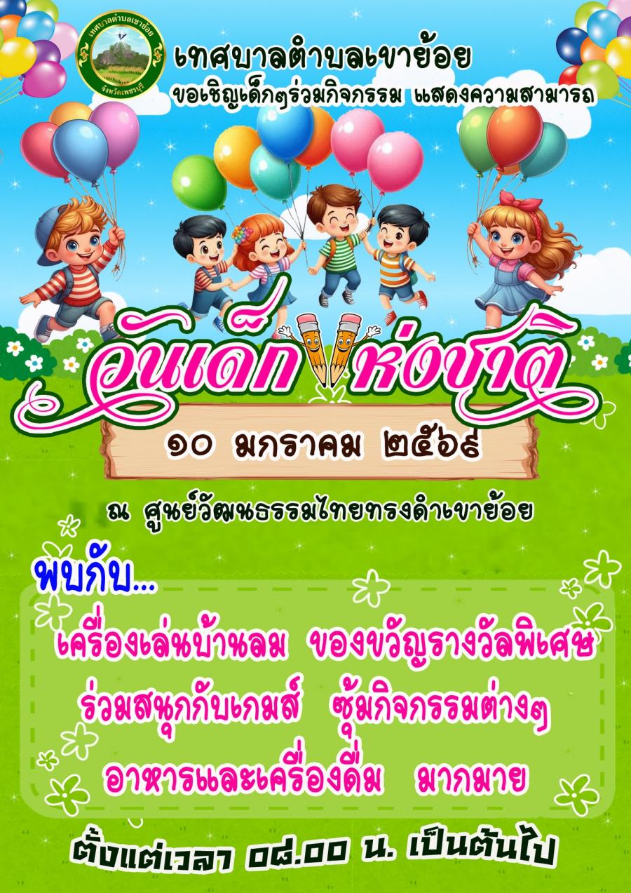 เทศบาลตำบลเขาย้อย ขอเชิญชวนผู้ปกครองทุกท่านและบุตรหลาน ร่วมกิจกรรมวันเด็กแห่งชาติ “10 มกราคม 2568 ณ ศูนย์วัฒนธรรมไทยทรงดำเขาย้อย เวลา 08.00 น. เป็นต้นไป