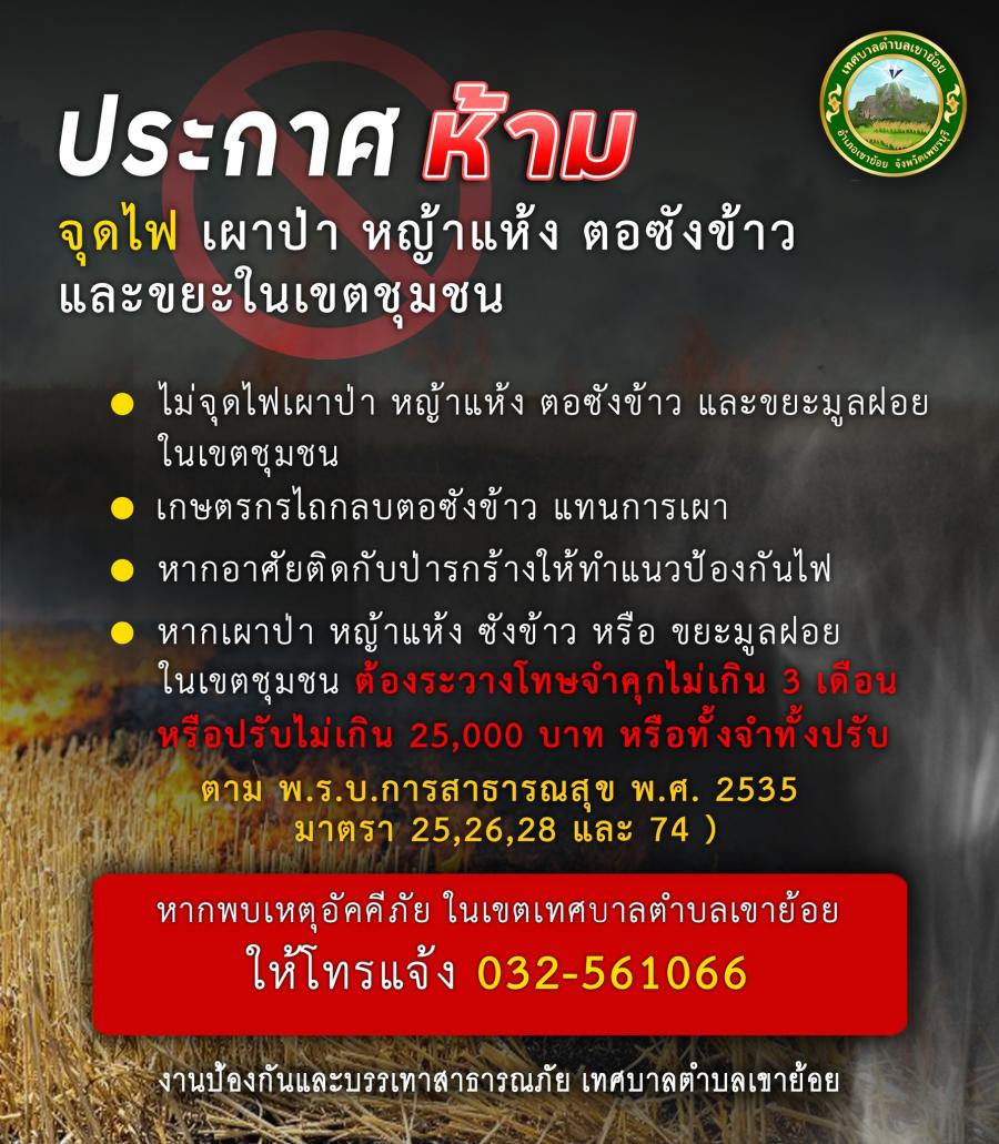 ข่าวประชาสัมพันธ์เทศบาลตำบลเขาย้อย ประกาศ ห้ามจุดไฟ เผาป่า หญ้าแห้ง ตอซังข้าว และขยะในเขตชุมชน