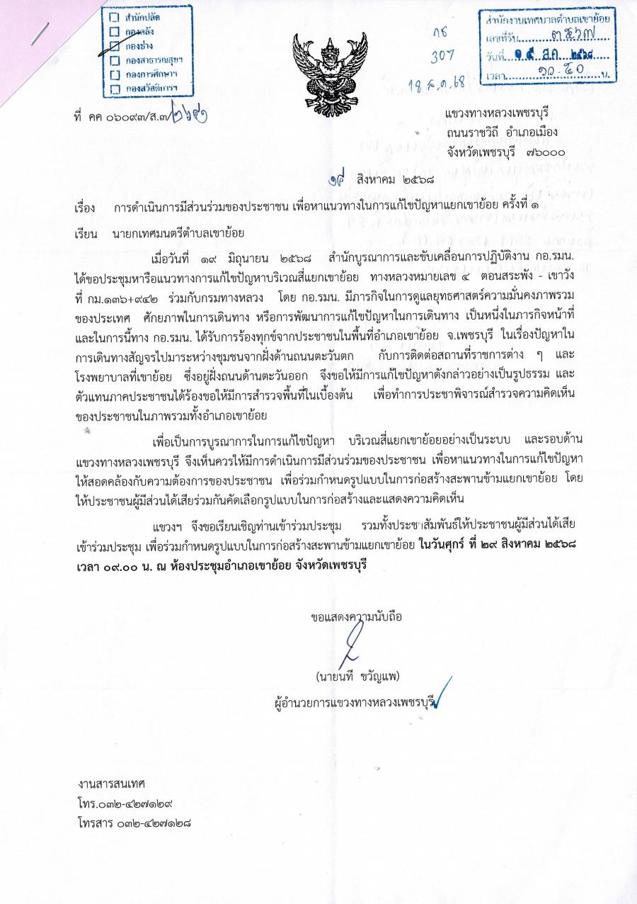 แขวงทางหลวงเพชรบุรี ขอเรียนเชิญประชาชนผู้มีส่วนได้เสีย เข้าร่วมประชุม เพื่อร่วมกำหนดรูปแบบในการก่อสร้างสะพานข้ามแยกเขาย้อย ในวันศุกร์ ที่ 29 สิงหาคม 2568 เวลา 09.00 น. ณ ห้องประชุมอำเภอเขาย้อย จังหวัดเพชรบุรี