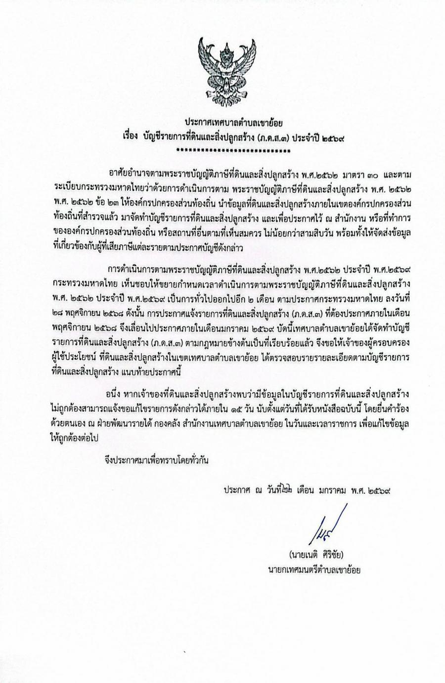 ประกาศเทศบาลตำบลเขาย้อย เรื่องบัญชีรายการที่ดินและสิ่งปลูกสร้าง (ภ.ด.ส.3) ประจำปี 2569